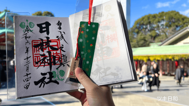 御朱印は種類がいくつも用意されており、参拝する季節ごとに異なるしおりをいただけます。写真にあるのは12月の御朱印で、雪をあしらったクリスマスらしいデザインのしおりです。